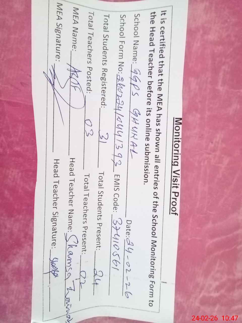 | Attendance Register | Head Teacher | MEA with School | Visit Proof |