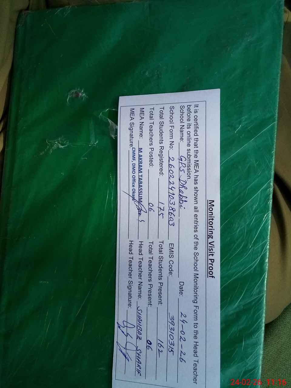 | Certified that this School was Inspected by the Undersigned MEA/DMO Today and the Information Stated Above is as Per Record. | |||||