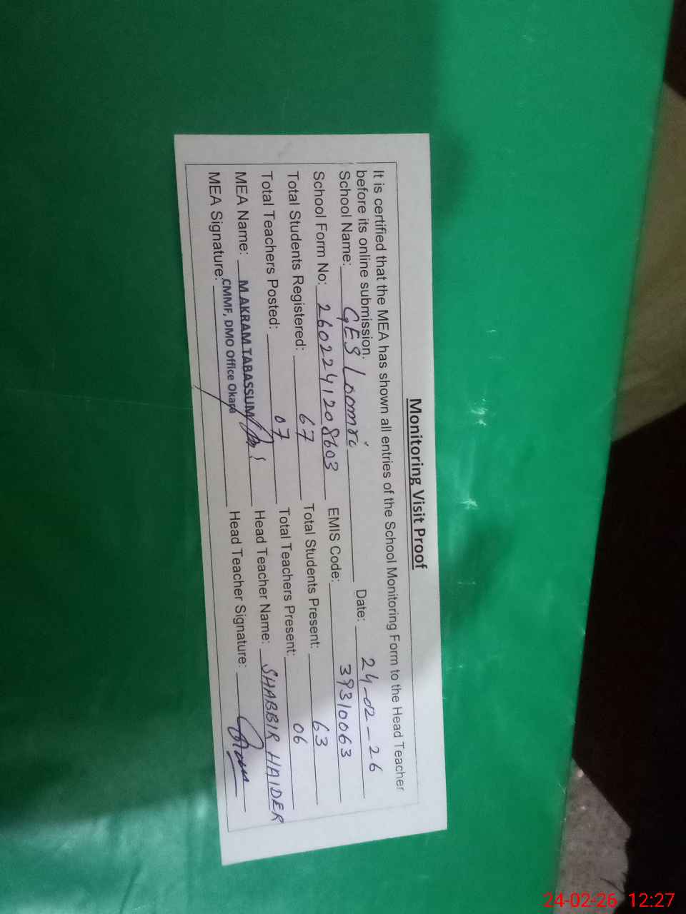 | Attendance Register | Head Teacher | MEA with School | Visit Proof |
