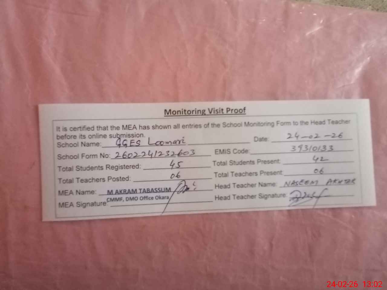 | Certified that this School was Inspected by the Undersigned MEA/DMO Today and the Information Stated Above is as Per Record. | |||||