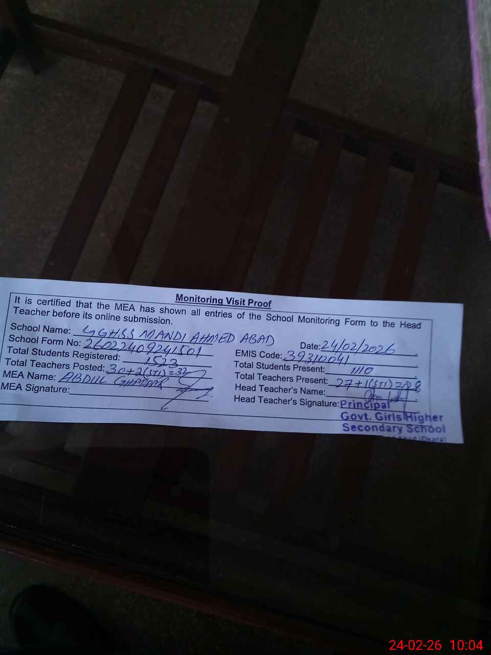 | Certified that this School was Inspected by the Undersigned MEA/DMO Today and the Information Stated Above is as Per Record. | |||||