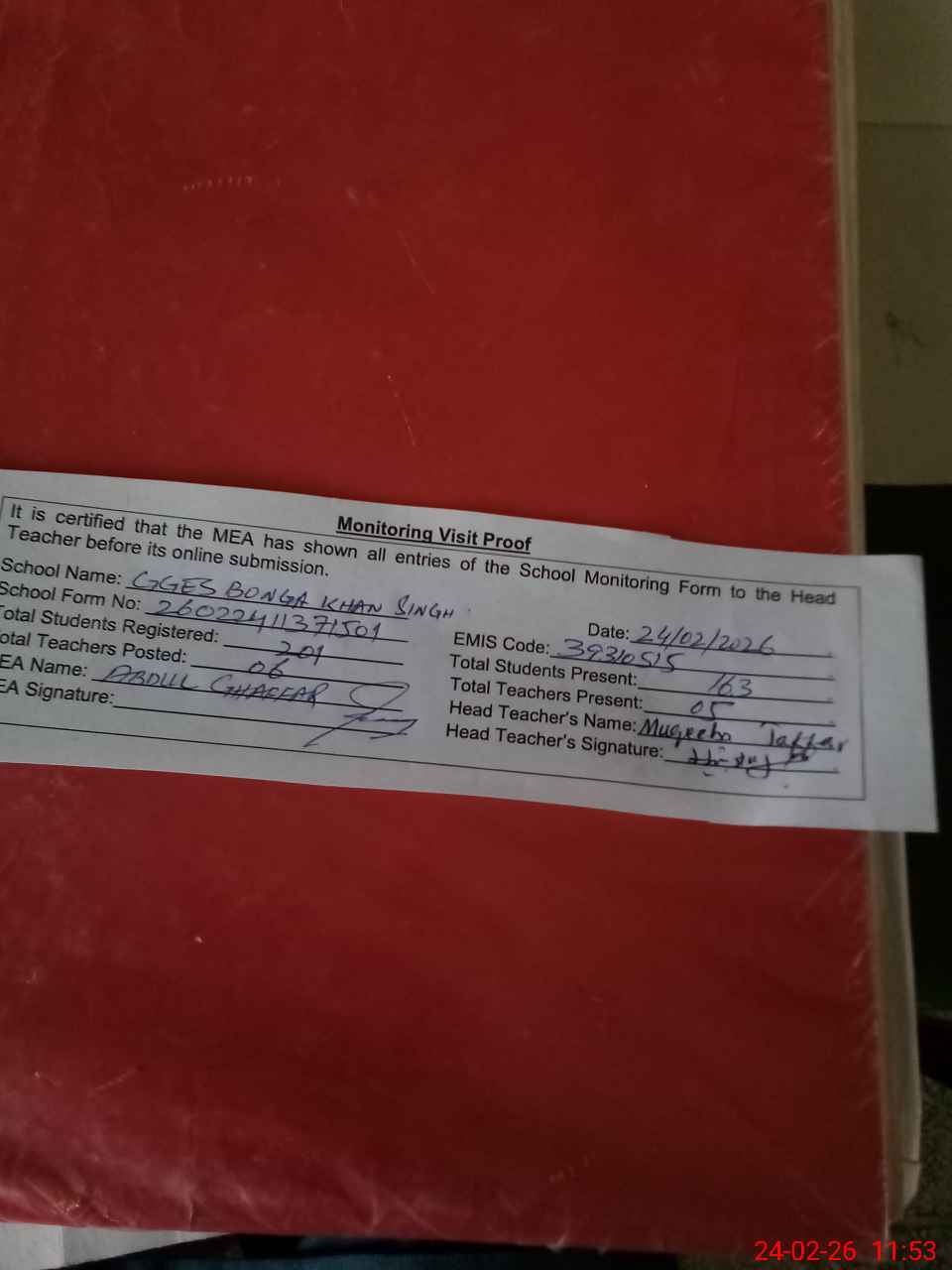 | Attendance Register | Head Teacher | MEA with School | Visit Proof |