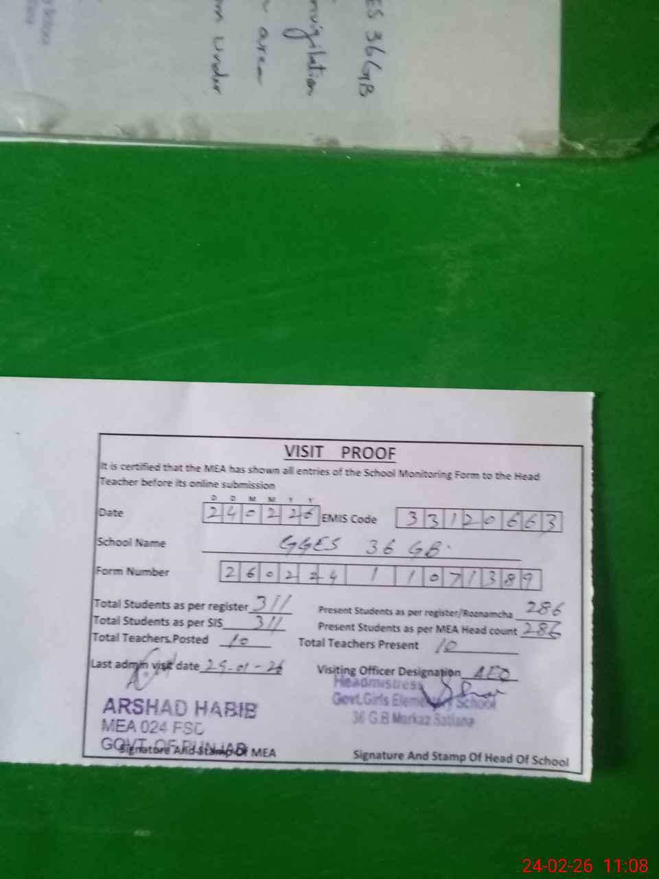 | Certified that this School was Inspected by the Undersigned MEA/DMO Today and the Information Stated Above is as Per Record. | |||||