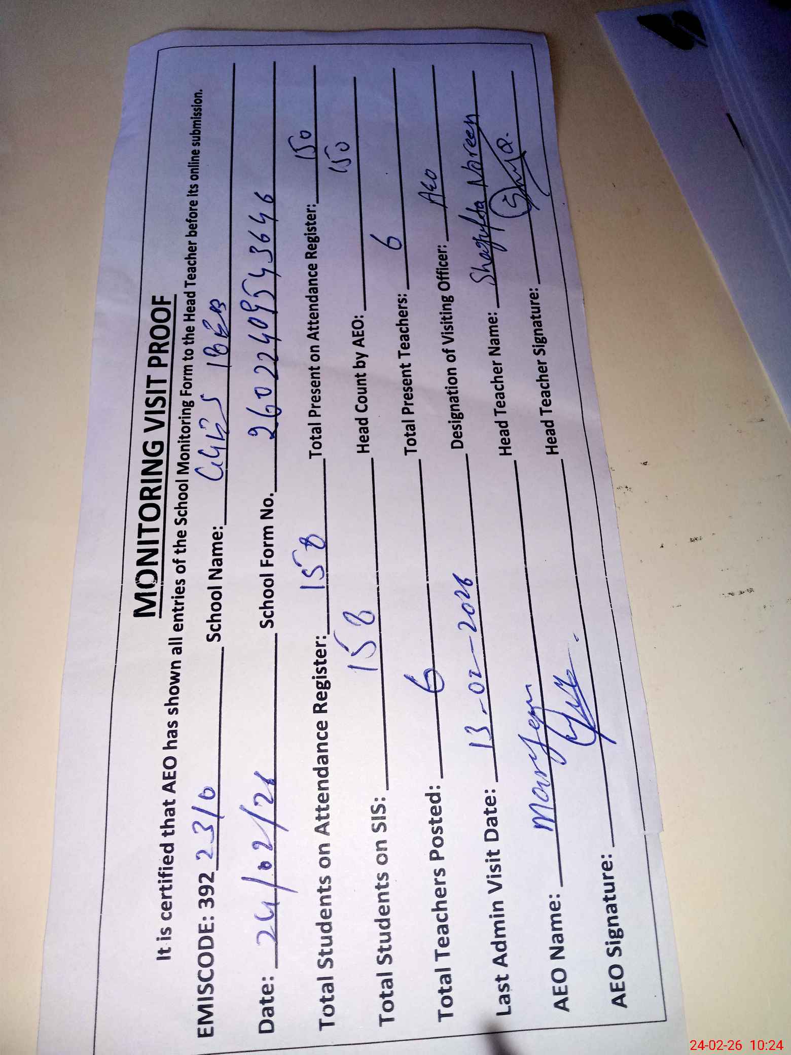 | Attendance Register | Head Teacher | MEA with School | Visit Proof |