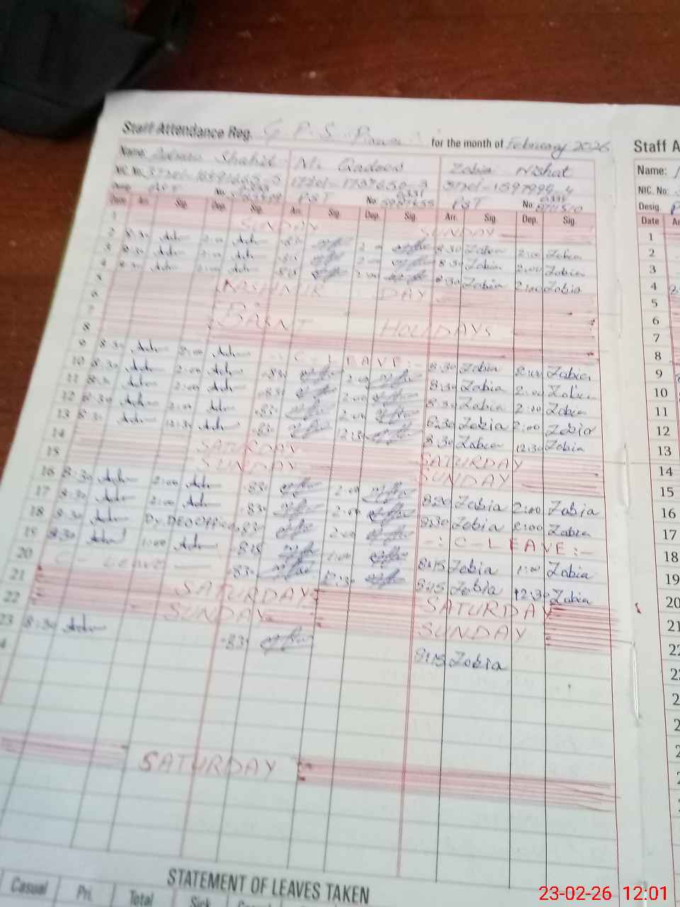 | CNIC | Full Name | Designation | R/C | Absence During Last Calender Month |