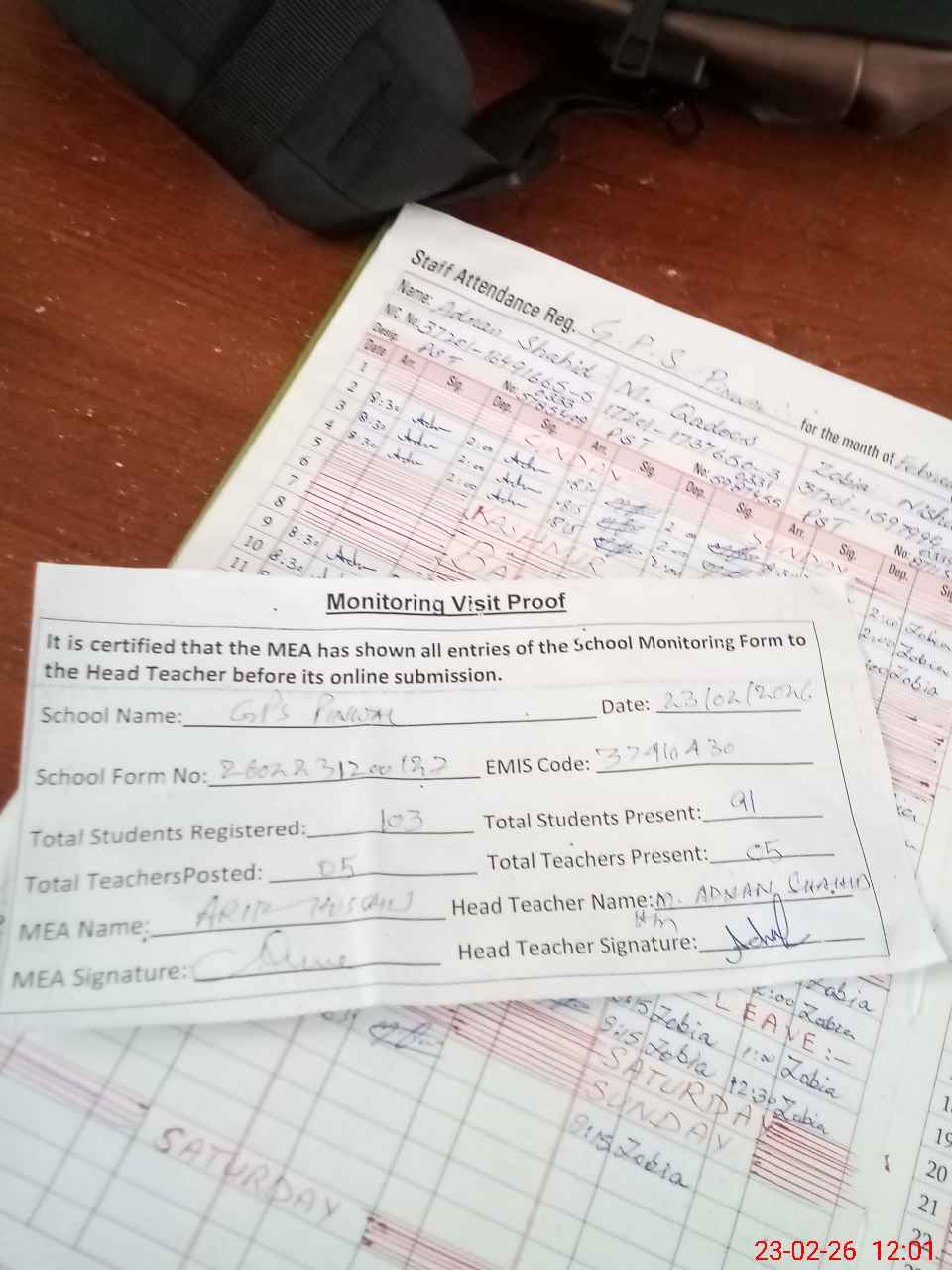 | Attendance Register | Head Teacher | MEA with School | Visit Proof |