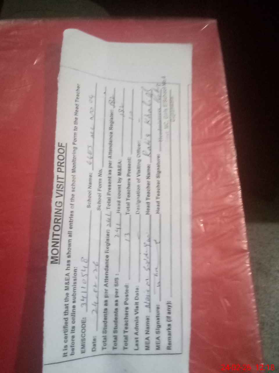 | Attendance Register | Head Teacher | MEA with School | Visit Proof |