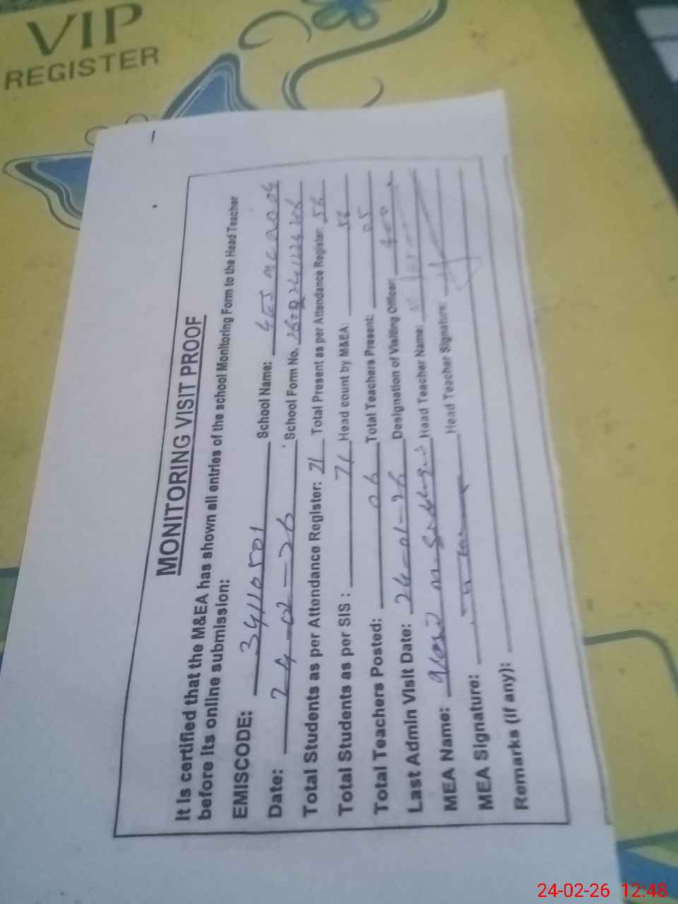 | Attendance Register | Head Teacher | MEA with School | Visit Proof |