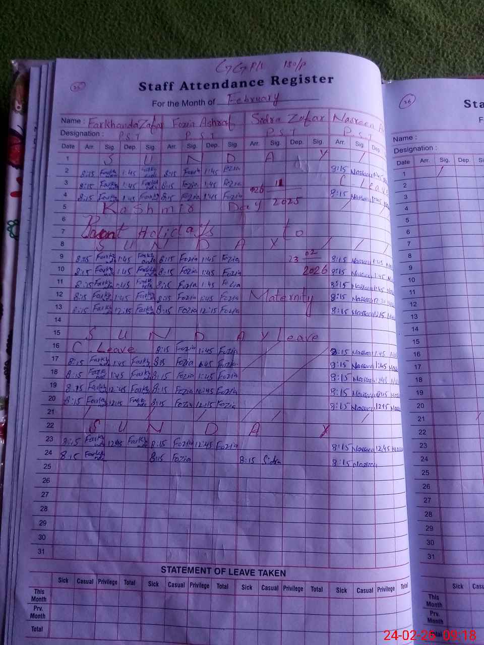 | Leave | Duty | Absent | Maternity | Medical | Ex- Pak |
