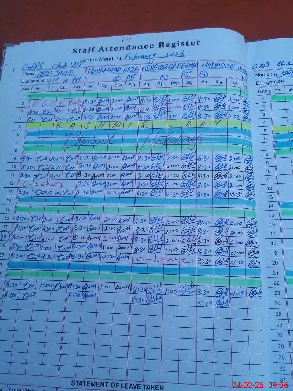 | Leave | Duty | Absent | Maternity | Medical | Ex- Pak |