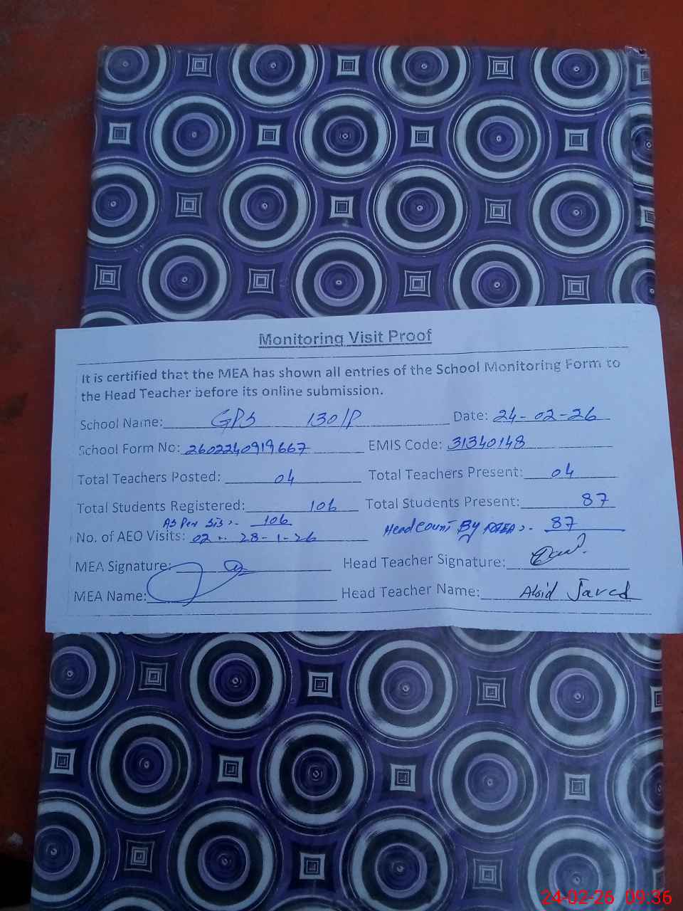 | Attendance Register | Head Teacher | MEA with School | Visit Proof |