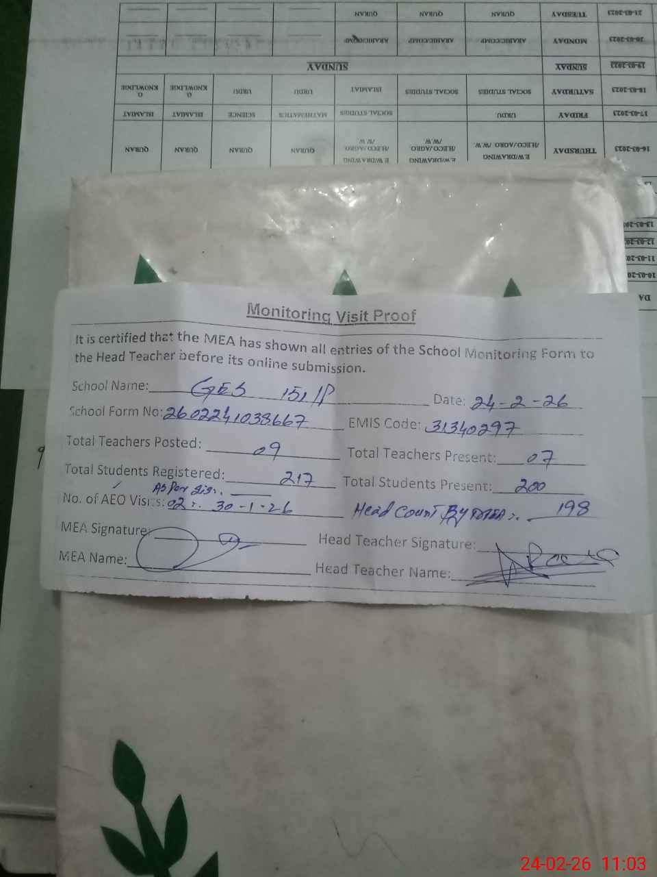 | Attendance Register | Head Teacher | MEA with School | Visit Proof |