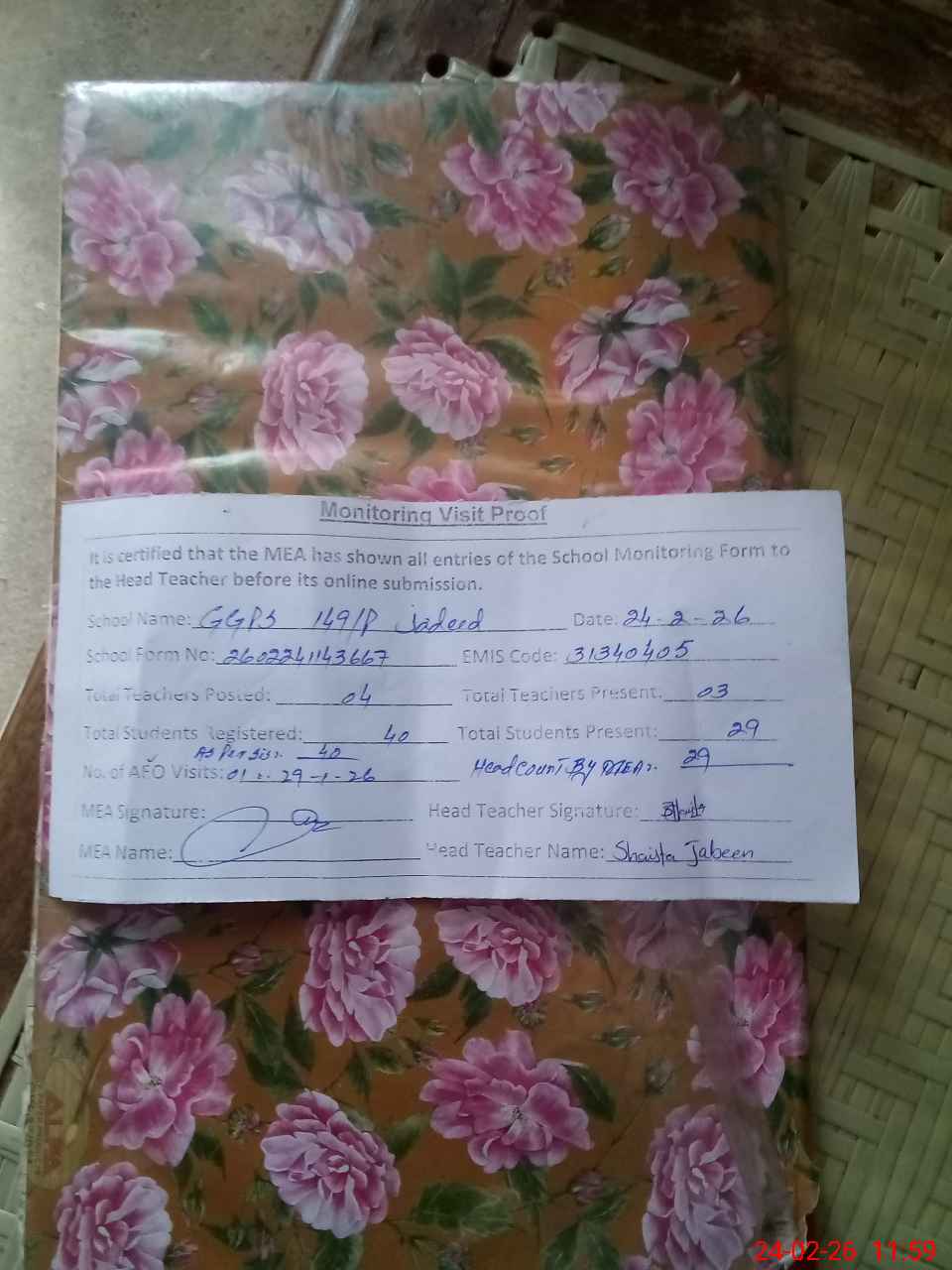 | Attendance Register | Head Teacher | MEA with School | Visit Proof |