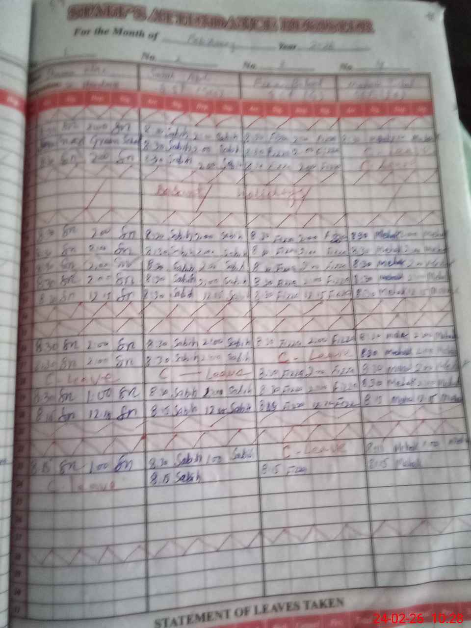 | Leave | Duty | Absent | Maternity | Medical | Ex- Pak |