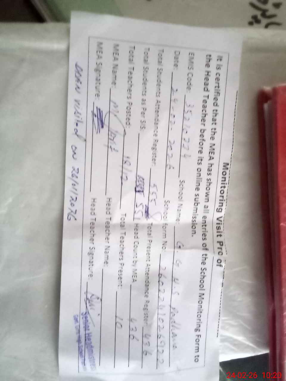 | Attendance Register | Head Teacher | MEA with School | Visit Proof |