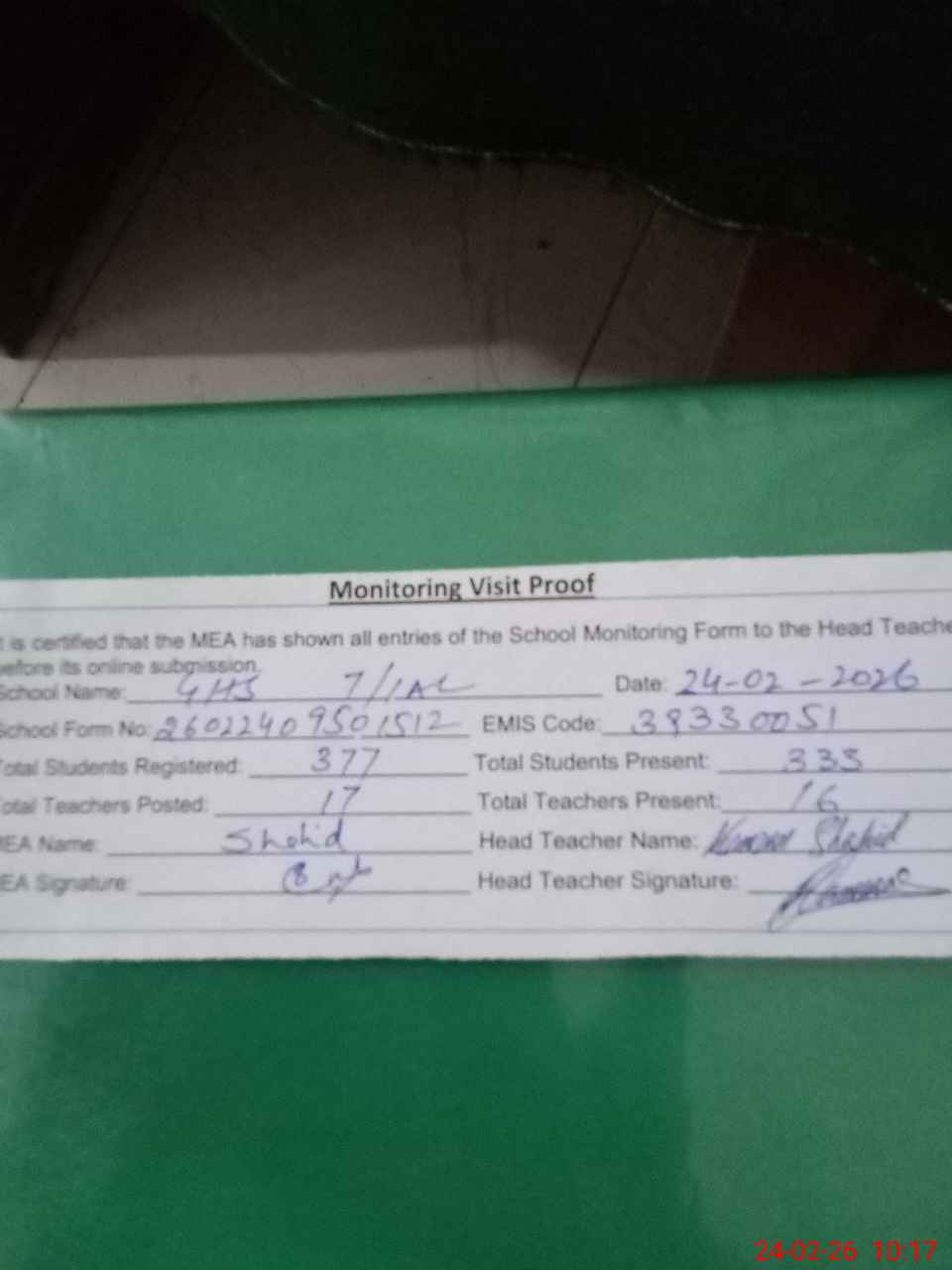 | Attendance Register | Head Teacher | MEA with School | Visit Proof |