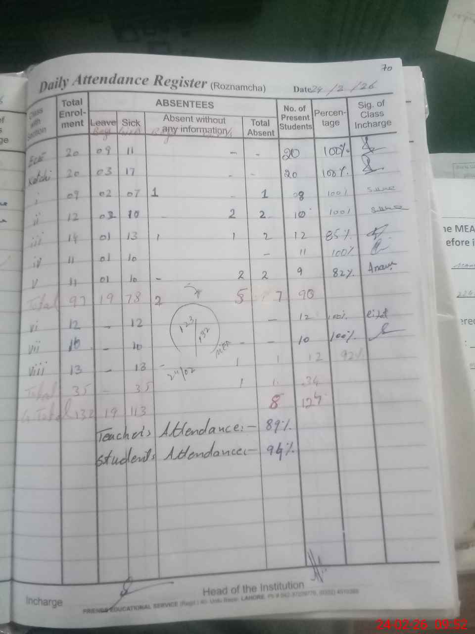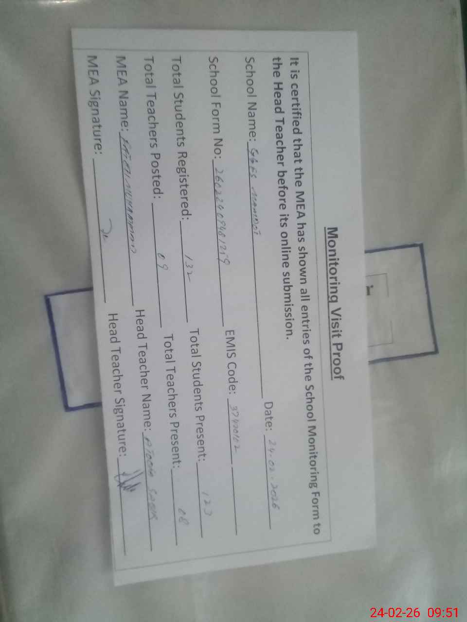 | Attendance Register | Head Teacher | MEA with School | Visit Proof |