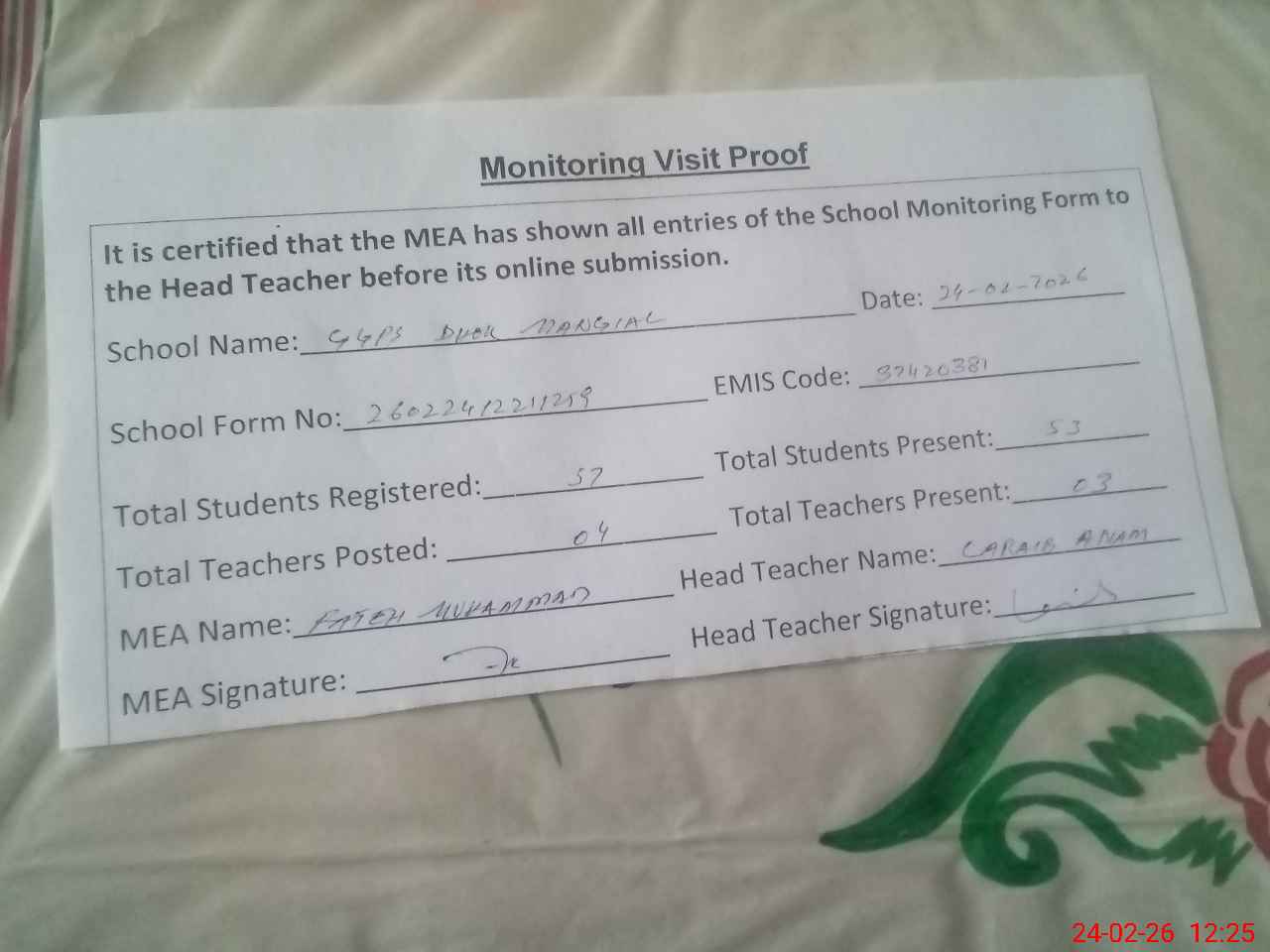 | Attendance Register | Head Teacher | MEA with School | Visit Proof |