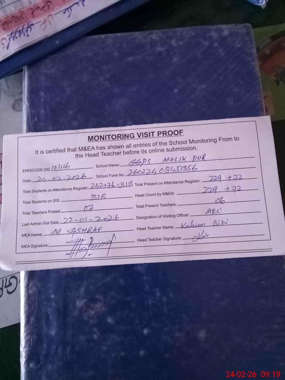 | Attendance Register | Head Teacher | MEA with School | Visit Proof |