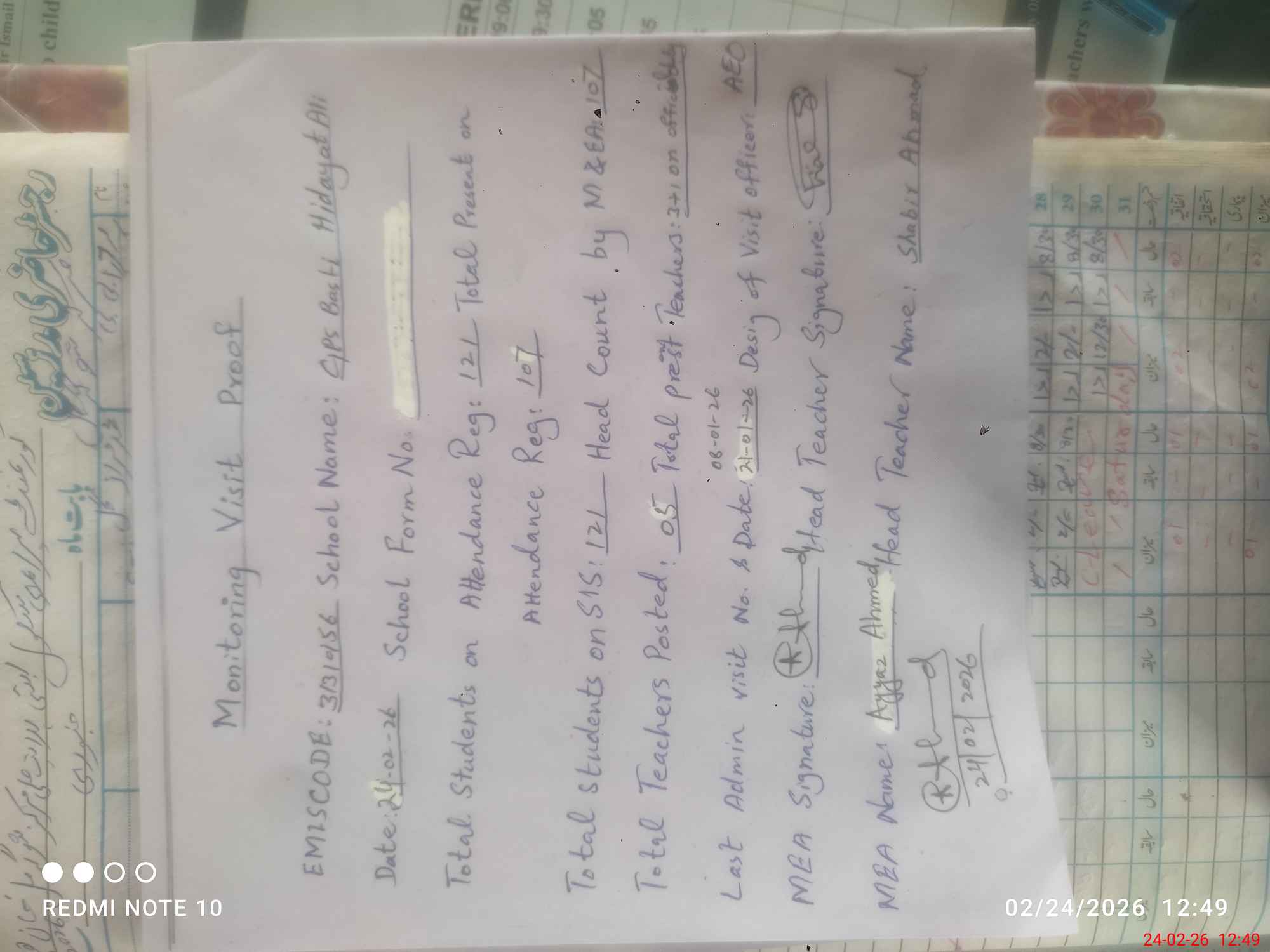 | Attendance Register | Head Teacher | MEA with School | Visit Proof |