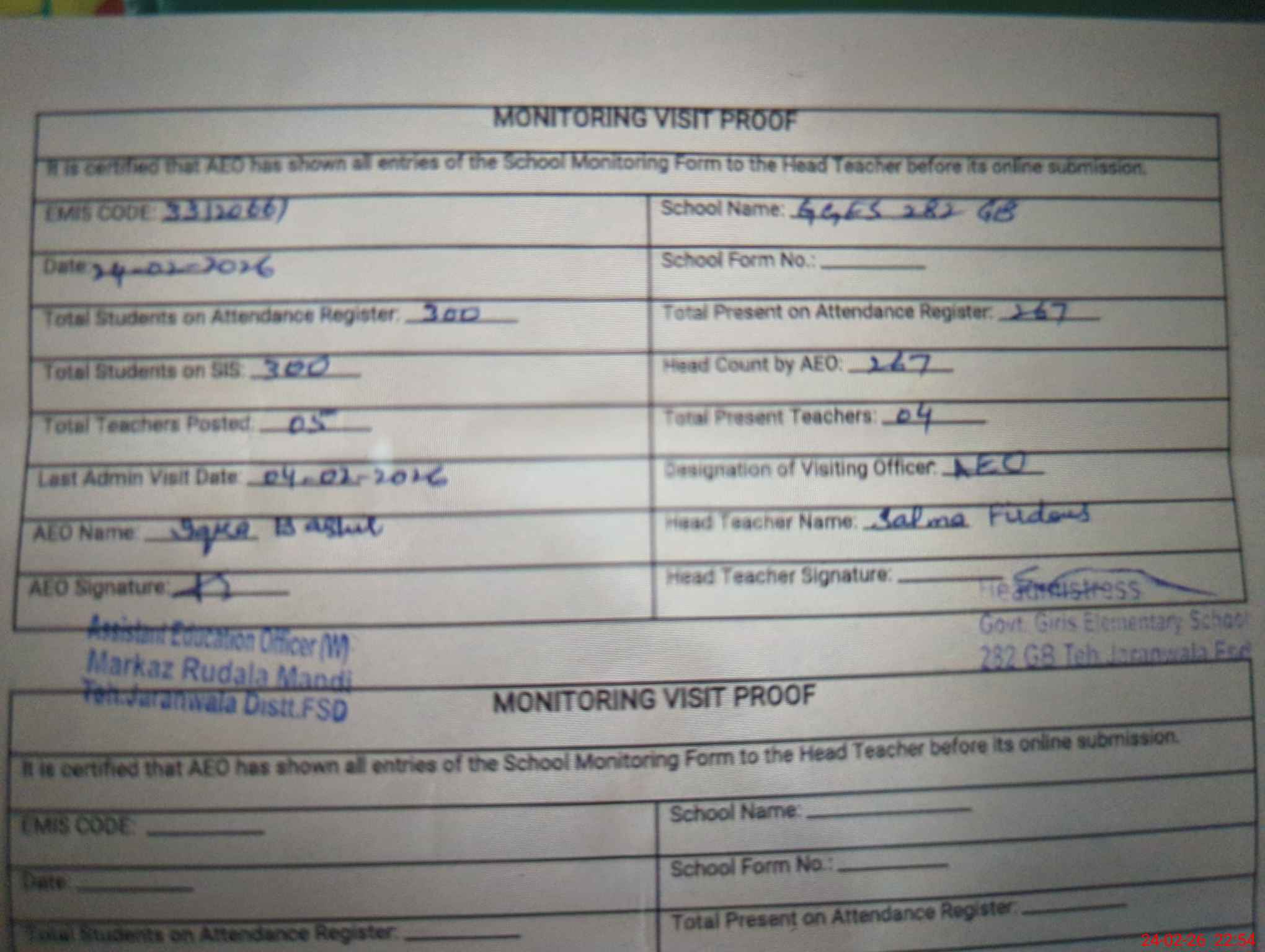 | EMIS Code: 33120661 | Name of School: GGES CHAK 282 GB SATIANA | |||