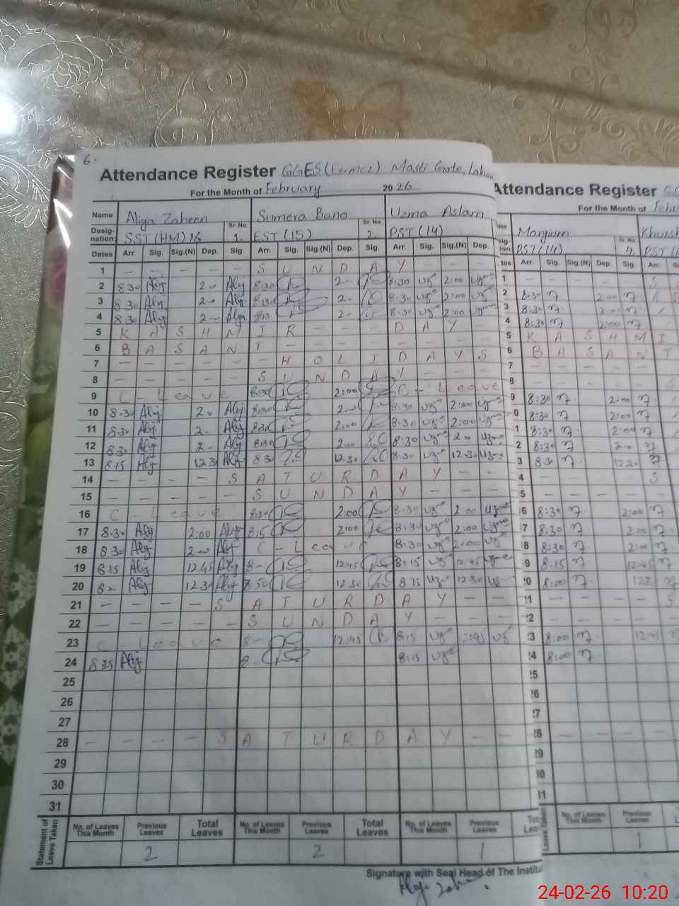 | 35**** | Kh**** Kh**** | PST Arts | Regular | 0 | 0 | 31 | 0 | 0 | 0 | 0 | 0 | 0 | Absent (Un-Authorized) |