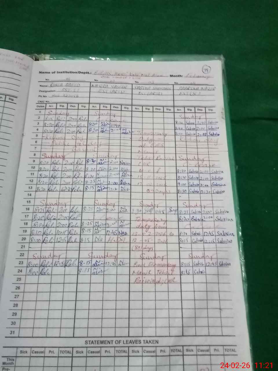 | Leave | Duty | Absent | Maternity | Medical | Ex- Pak |