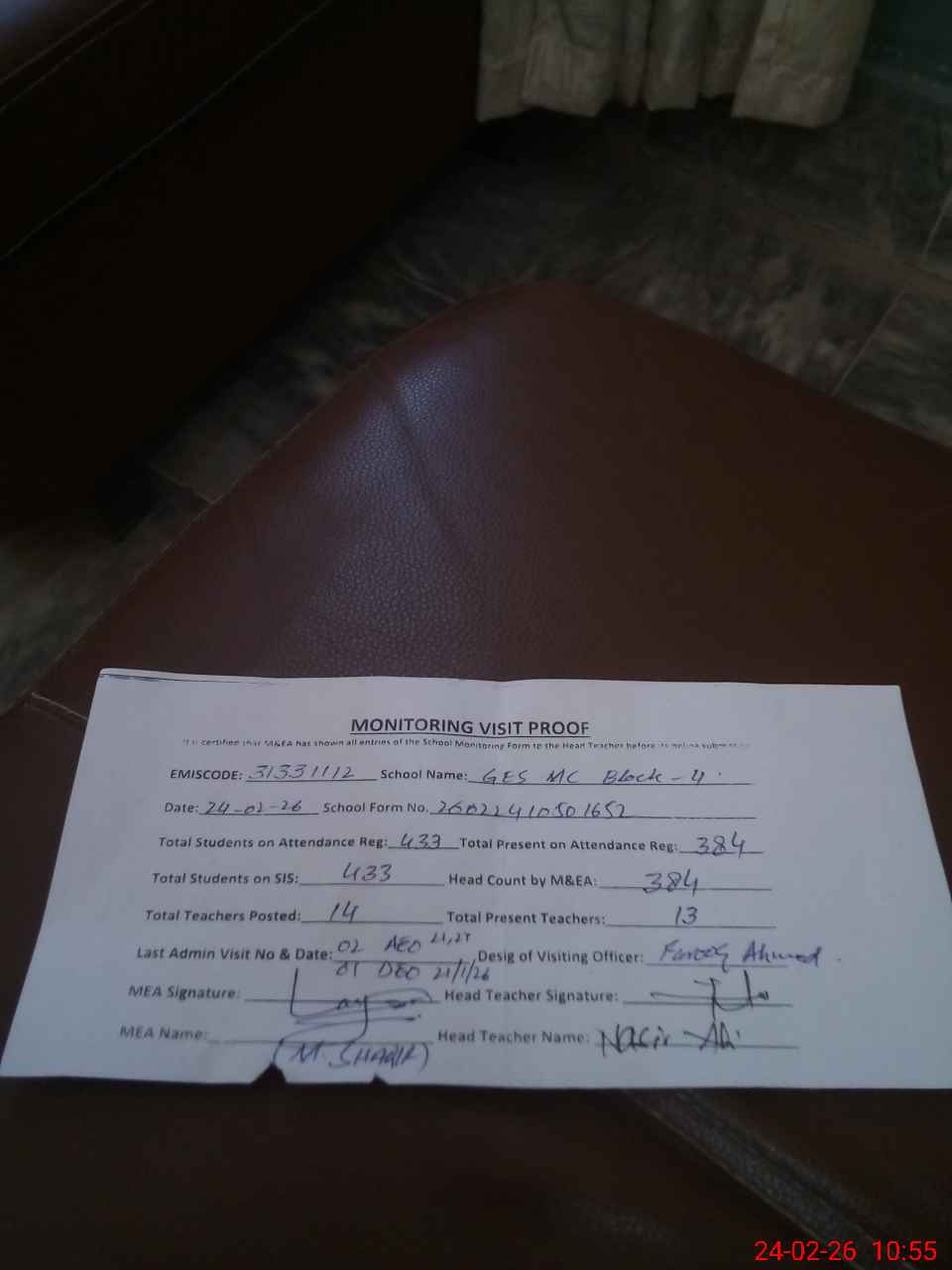 | Attendance Register | Head Teacher | MEA with School | Visit Proof |