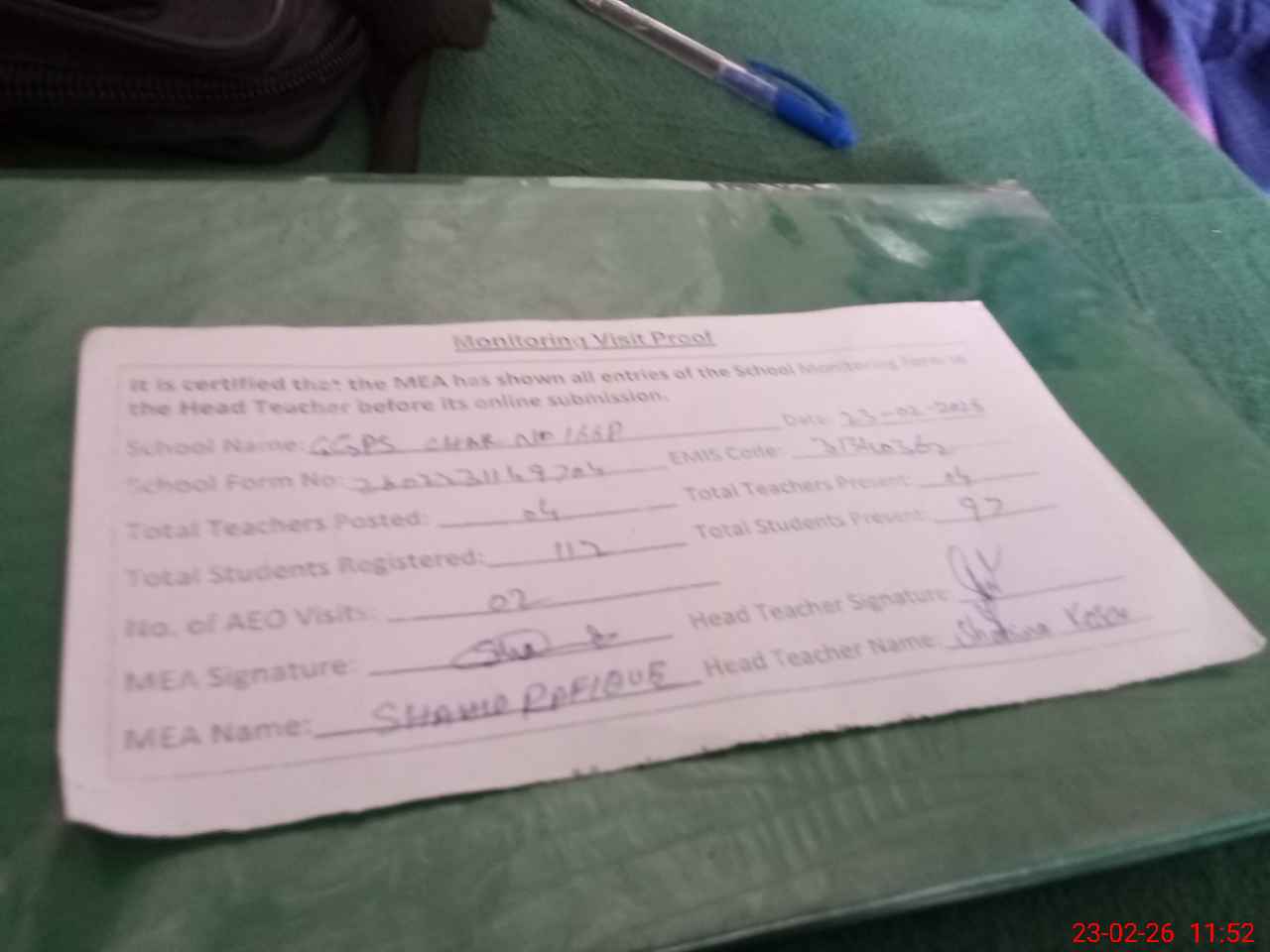 | Attendance Register | Head Teacher | MEA with School | Visit Proof |