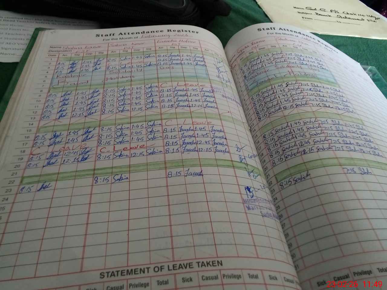 | Leave | Duty | Absent | Maternity | Medical | Ex- Pak |