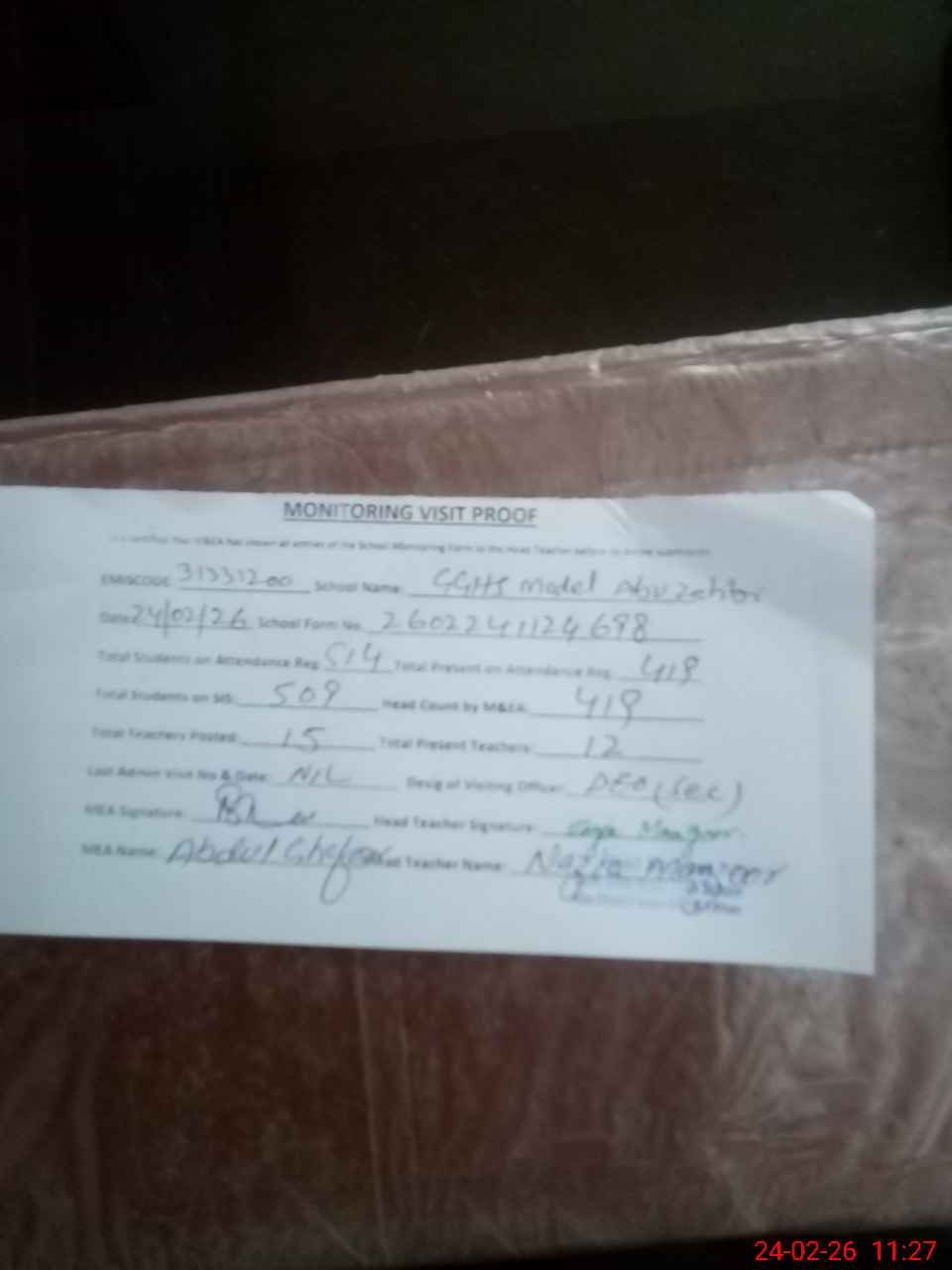 | Attendance Register | Head Teacher | MEA with School | Visit Proof |