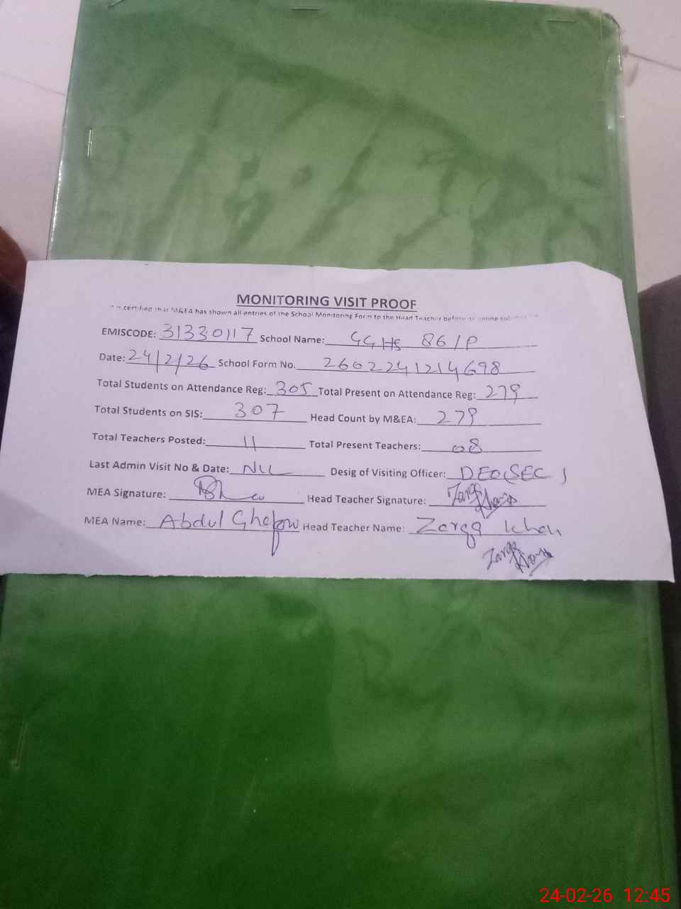 | Attendance Register | Head Teacher | MEA with School | Visit Proof |