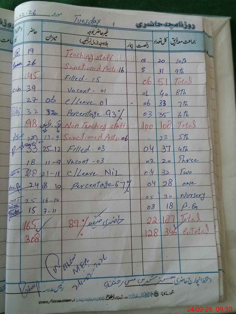 | Remarks (Use Separate Page if Required): Sst Night and Est Rehana both teachers came at about 0913 so marked them latecomers Science lab one wall found cracked and repairing work is required | |||||