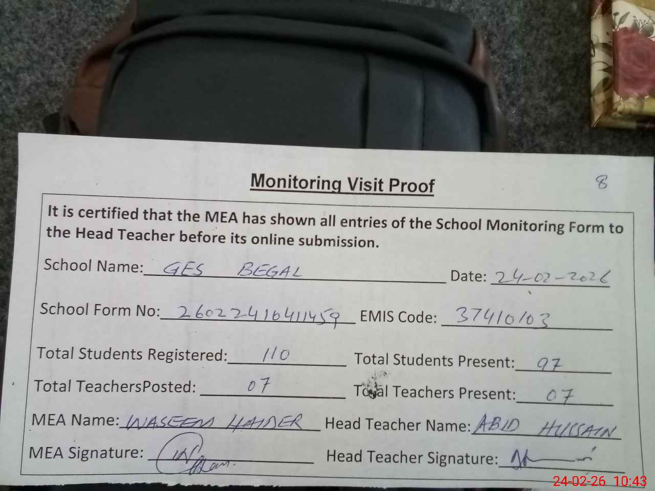 | Attendance Register | Head Teacher | MEA with School | Visit Proof |