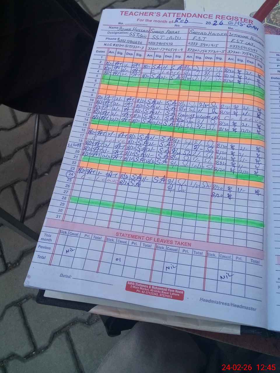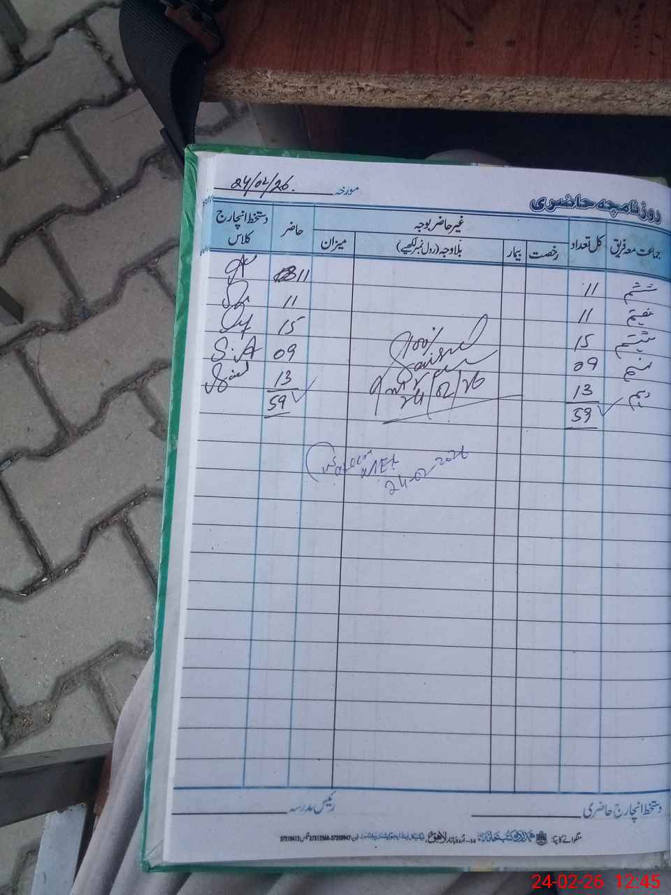 | Remarks (Use Separate Page if Required): Head teacher was marked on casual leave but no online approved leave record was available in school so I marked him unauthorized One classroom wooden door found broken from hinge point | |||||