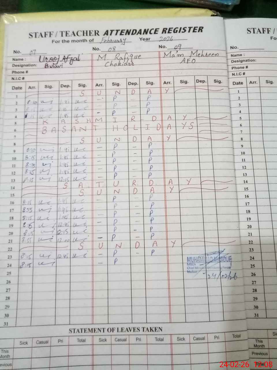 | CNIC | Full Name | Designation | R/C | Absence During Last Calender Month |
