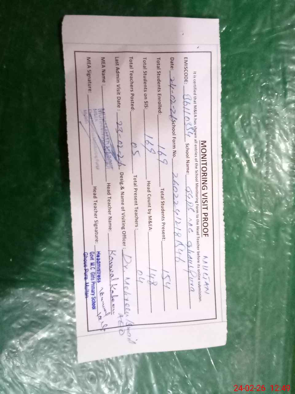 | Attendance Register | Head Teacher | MEA with School | Visit Proof |