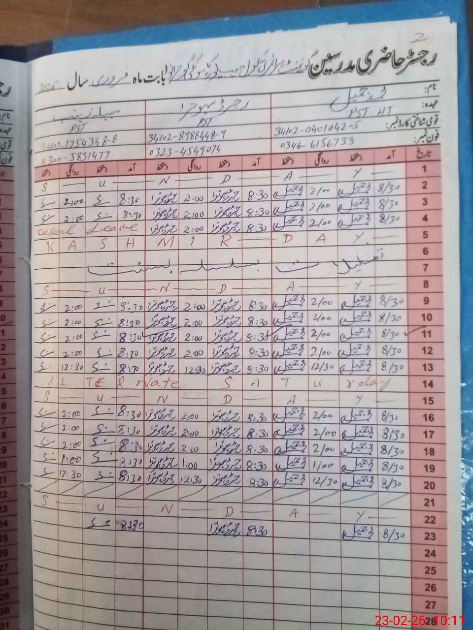 | CNIC | Full Name | Designation | R/C | Absence During Last Calender Month |