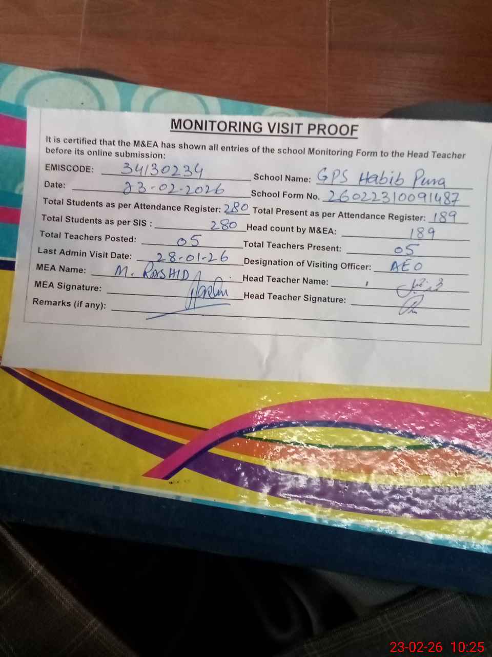 | Attendance Register | Head Teacher | MEA with School | Visit Proof |