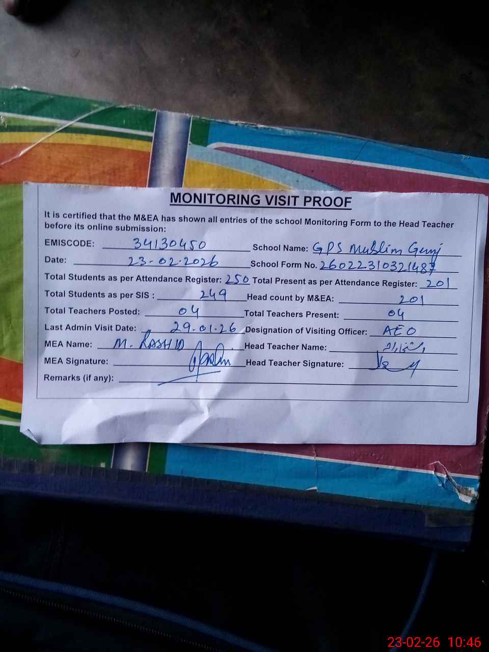 | Attendance Register | Head Teacher | MEA with School | Visit Proof |