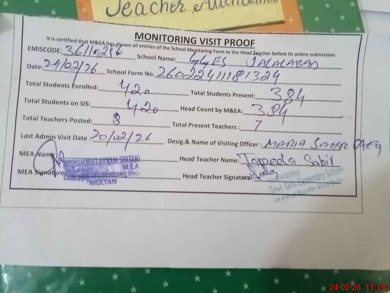| Attendance Register | Head Teacher | MEA with School | Visit Proof |