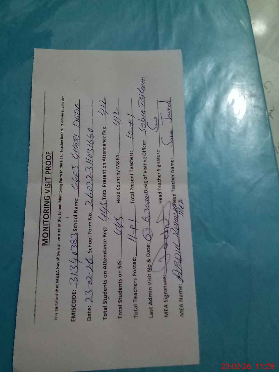 | Attendance Register | Head Teacher | MEA with School | Visit Proof |