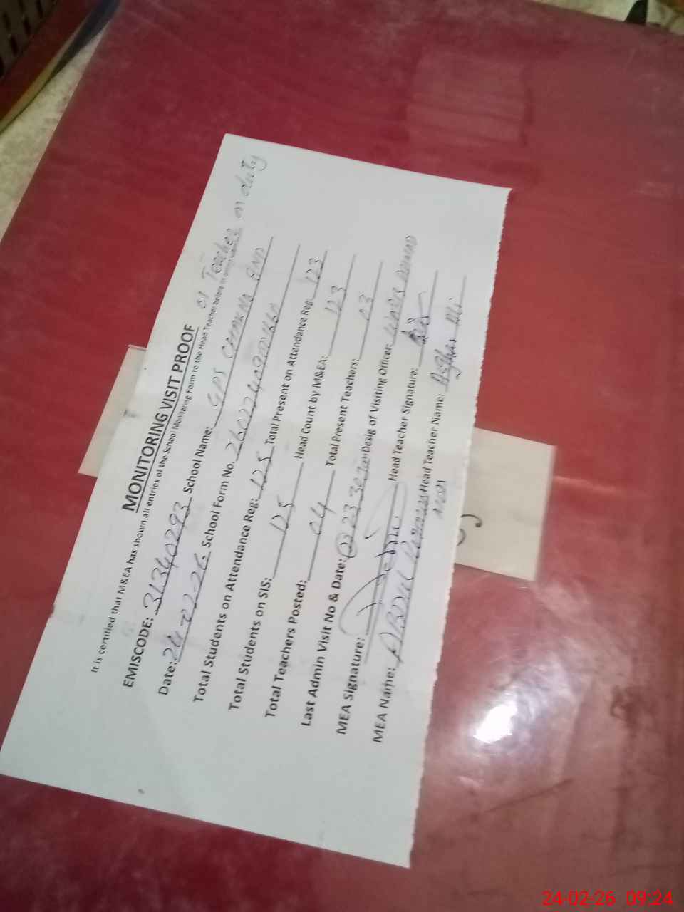 | Attendance Register | Head Teacher | MEA with School | Visit Proof |