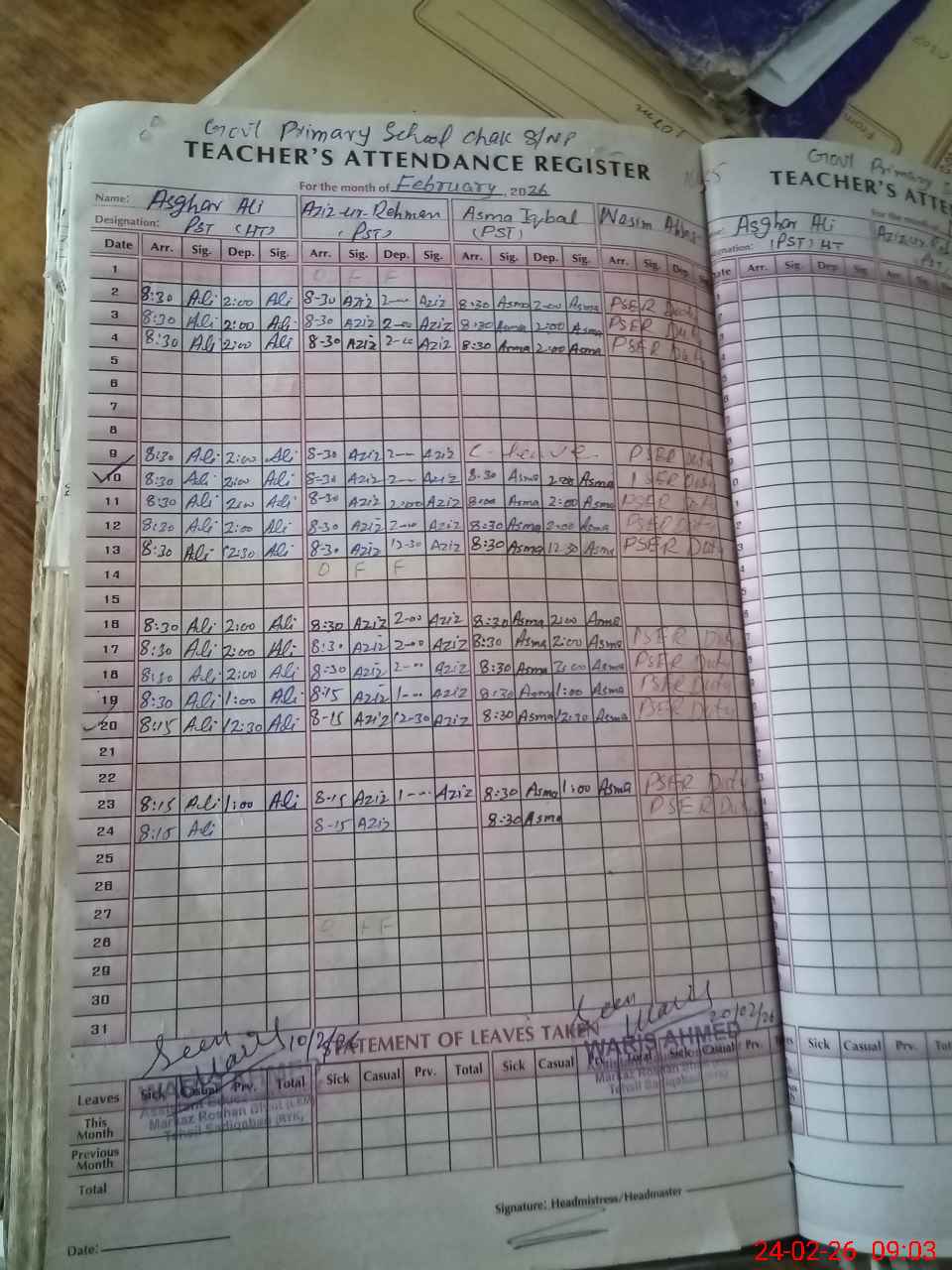 | Name: As**** Al**** Designation: (School Headmaster's/Headmistress's) PST/PTC/JV Phone/Cell Number: 03**** |