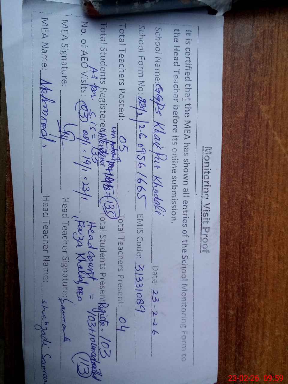 | Attendance Register | Head Teacher | MEA with School | Visit Proof |