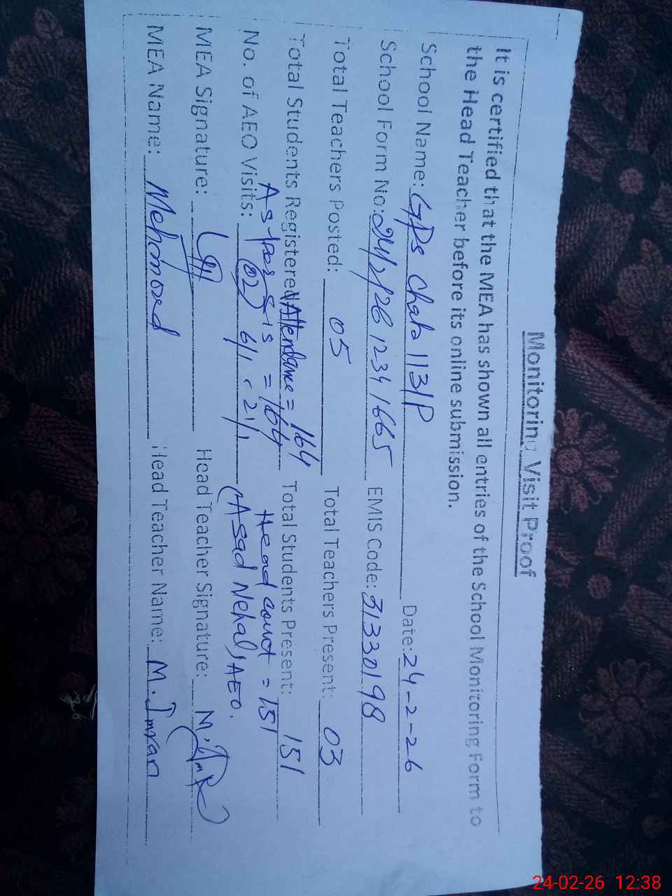 | Certified that this School was Inspected by the Undersigned MEA/DMO Today and the Information Stated Above is as Per Record. | |||||