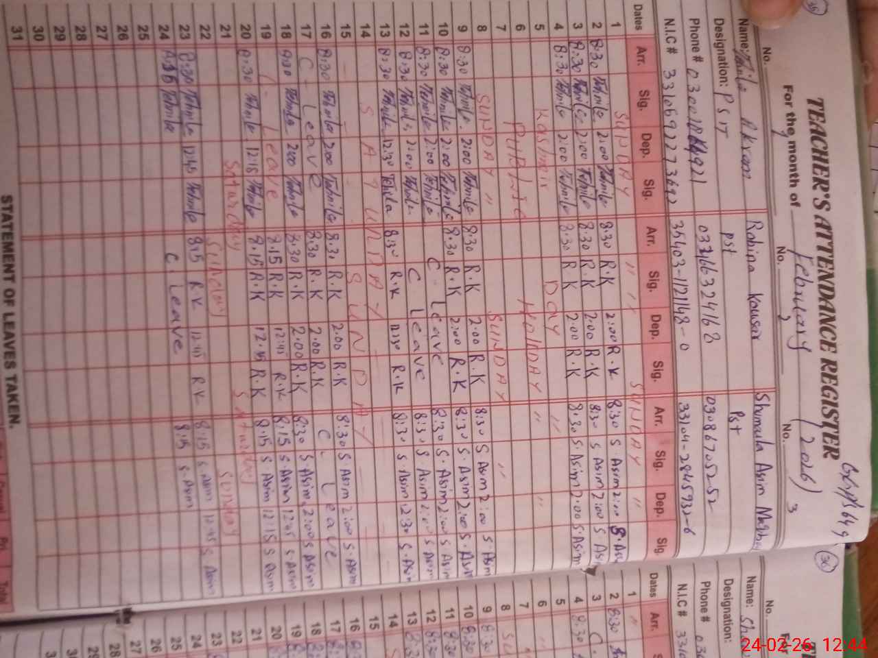 | CNIC | Full Name | Designation | R/C | Absence During Last Calender Month |