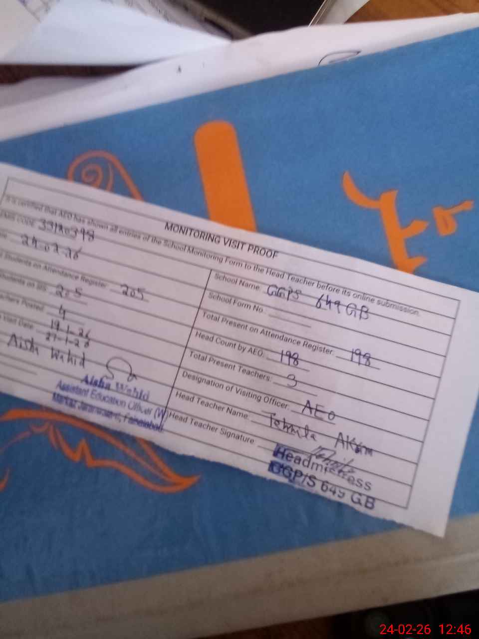 | Attendance Register | Head Teacher | MEA with School | Visit Proof |