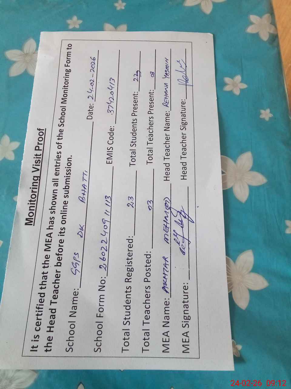 | Attendance Register | Head Teacher | MEA with School | Visit Proof |