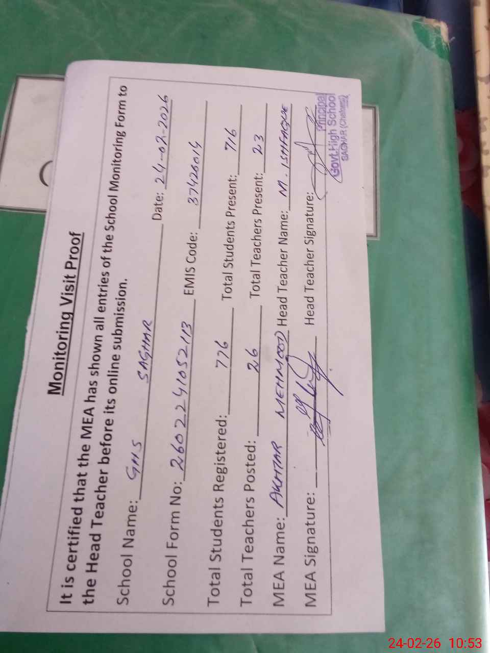 | Certified that this School was Inspected by the Undersigned MEA/DMO Today and the Information Stated Above is as Per Record. | |||||